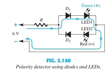 Melalui penggunaan LED dengan warna berbeda, jaringan sederhana dari Gambar 2.140 dapat digunakan untuk memeriksa polaritas pada setiap titik di jaringan dc. Ketika polaritas seperti yang ditunjukkan D1 akan berjalan bersama dengan LED1, dan cahaya hijau akan dihasilkan. D2 dan LED2 akan bias kembali untuk polaritas lebih. Namun, jika polaritas pada input dibalik, D2 dan LED2 akan mengalir, dan lampu merah menyala